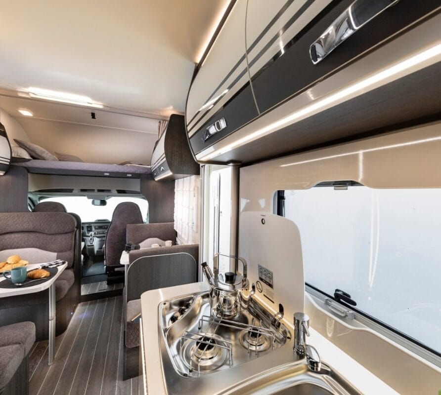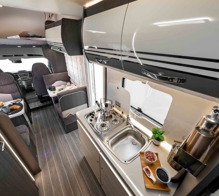 ✔ Overcab double bed – Spacious and comfortable ✔ Rear bunk beds – Ideal for kids or extra guests ✔ Convertible dinette – Transforms into additional sleeping spaceFully Equipped Kitchen